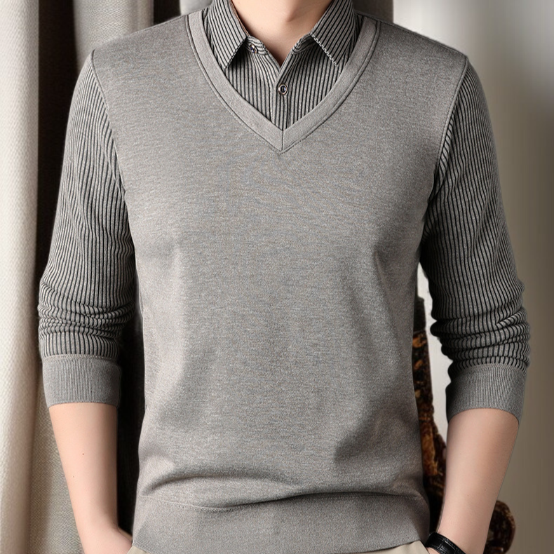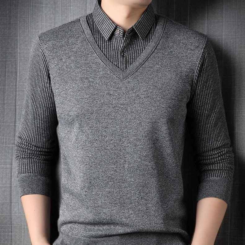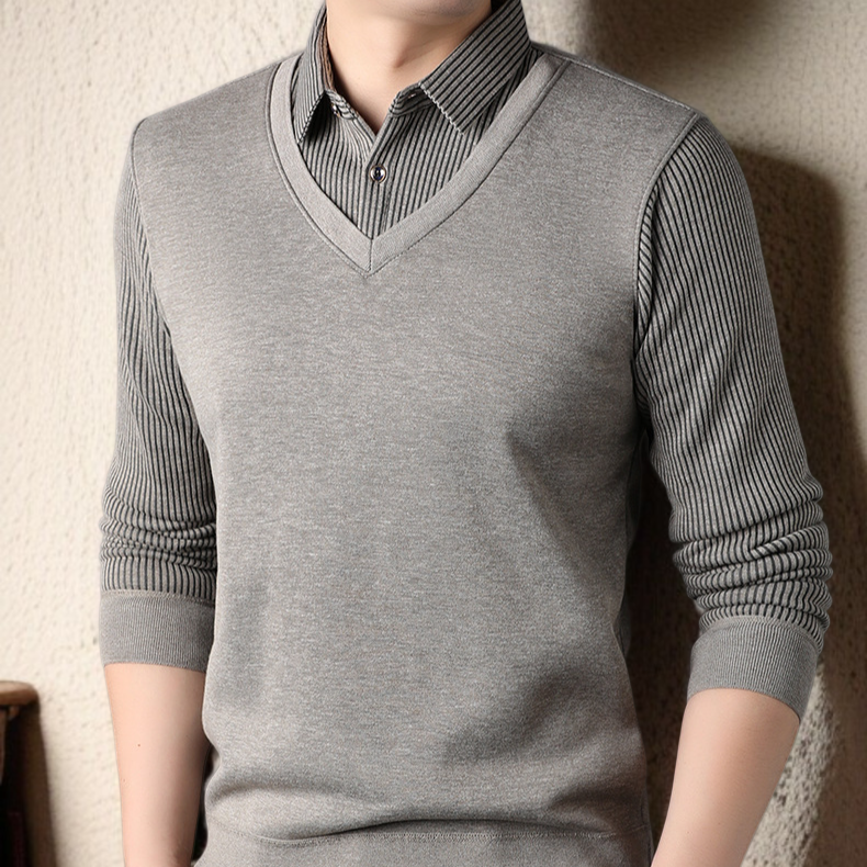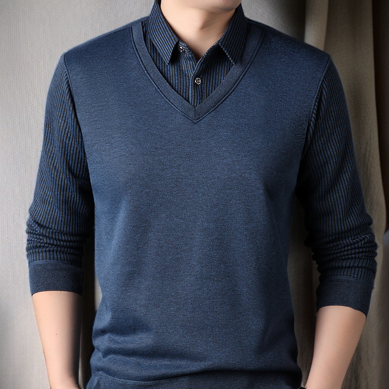 남자 겨울 니트 셔츠 가짜 투피스 기모 도톰 니트 셔츠 솔리드 스트라이프 니트 셔츠